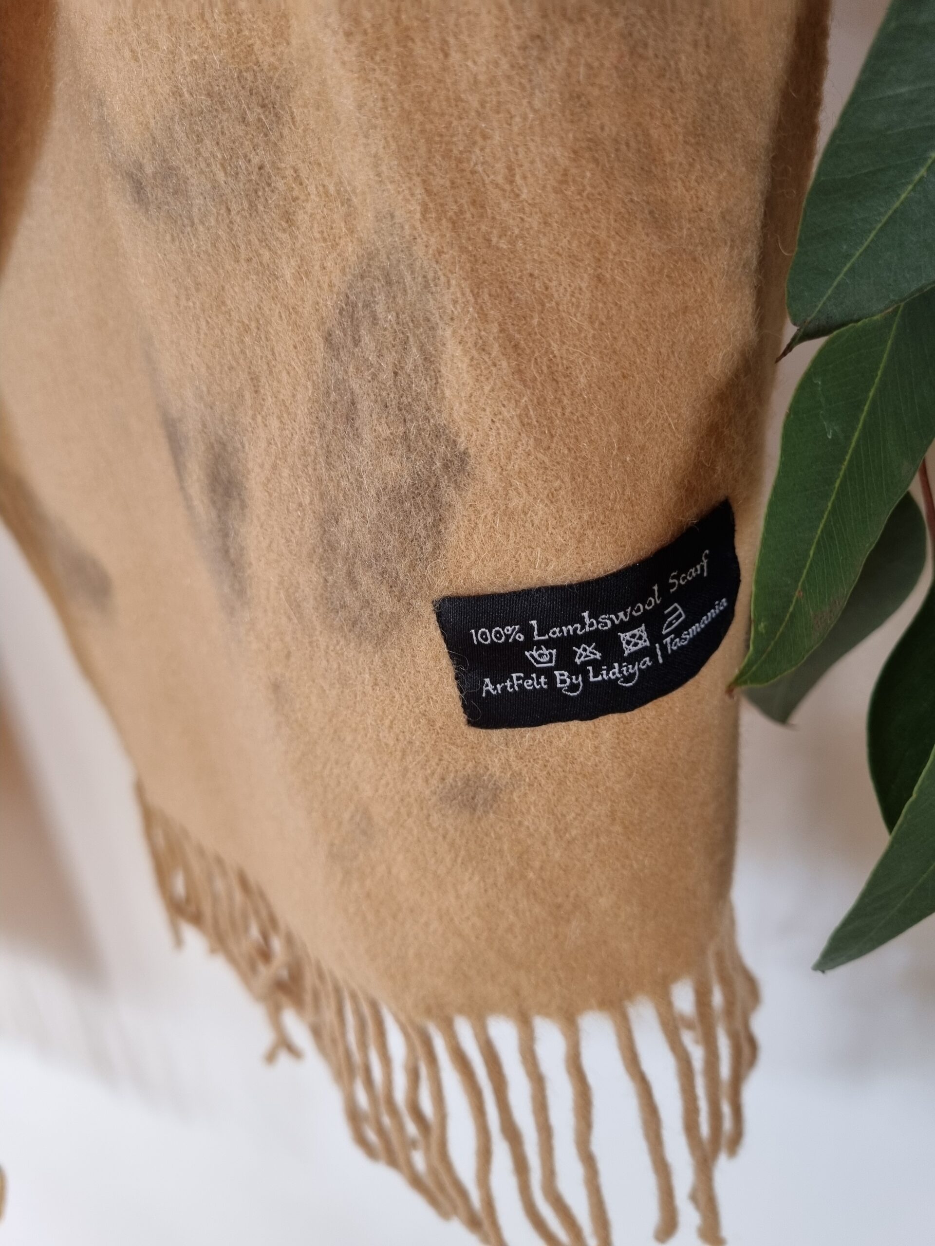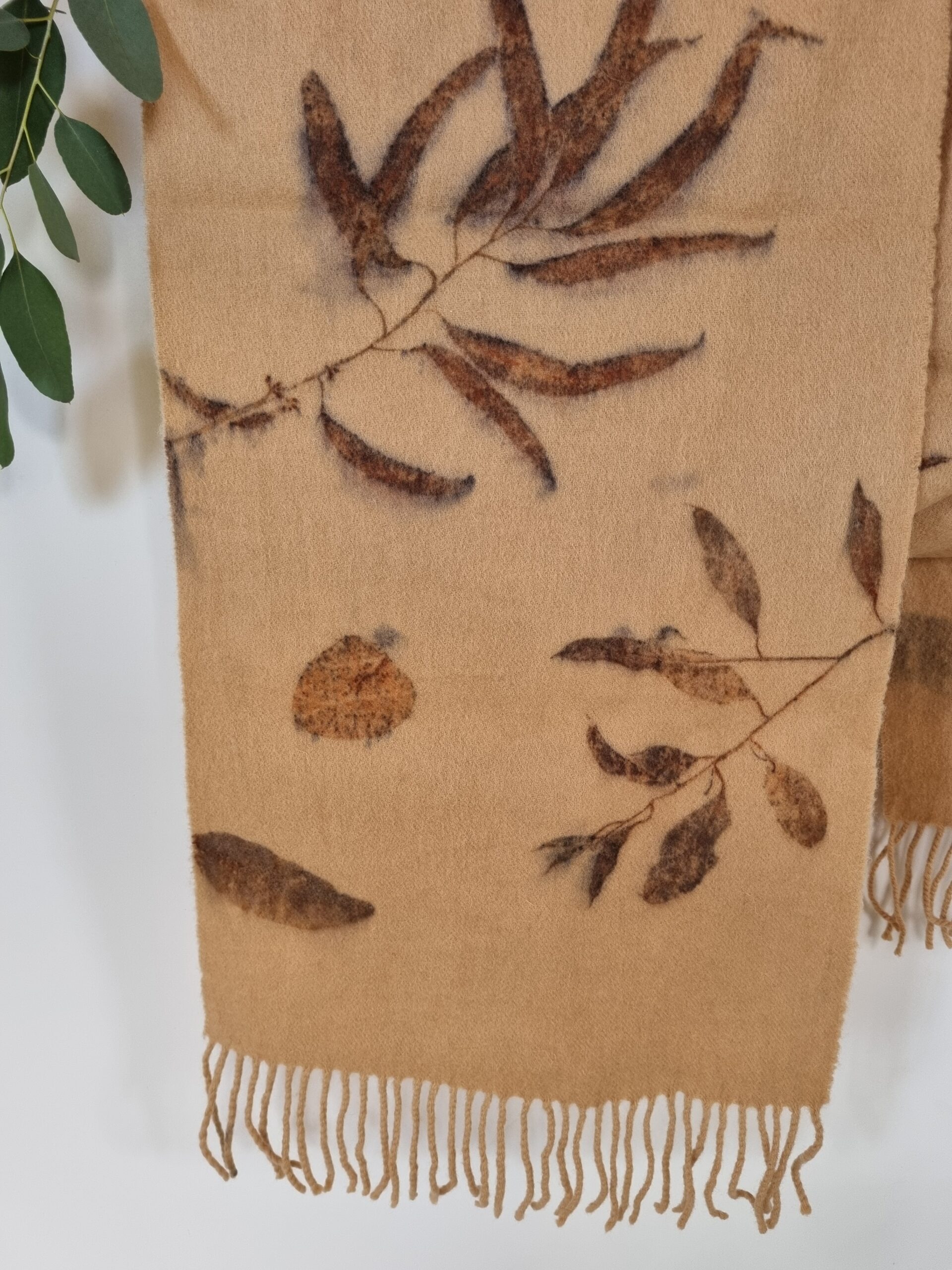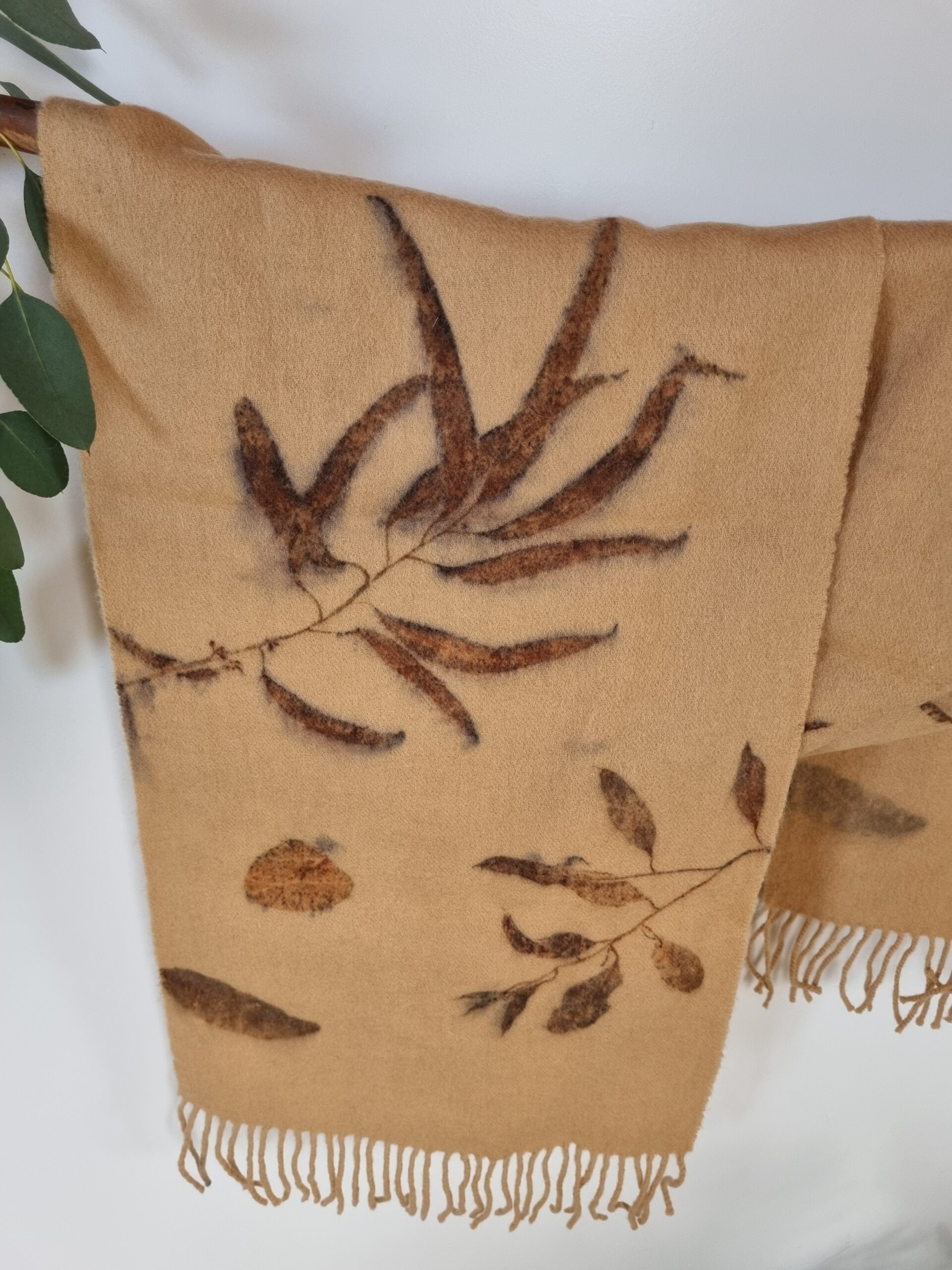 All of my scarfs are naturally dyed in my home studio using various different leaves such as: eucalyptus, fern, maple, birch,  oak, seaweeds and many others, foraged locally from the Tasmanian bush and my garden.  The fresh leaves are contact printed onto the scarf with a gentle steaming process. Once the leaves are used I can’t use them again, and the leaves go back to earth in my compost. That’s why all of the scarves are one of a kind. No nasty chemicals, just the power and hidden beauty of the leaves.