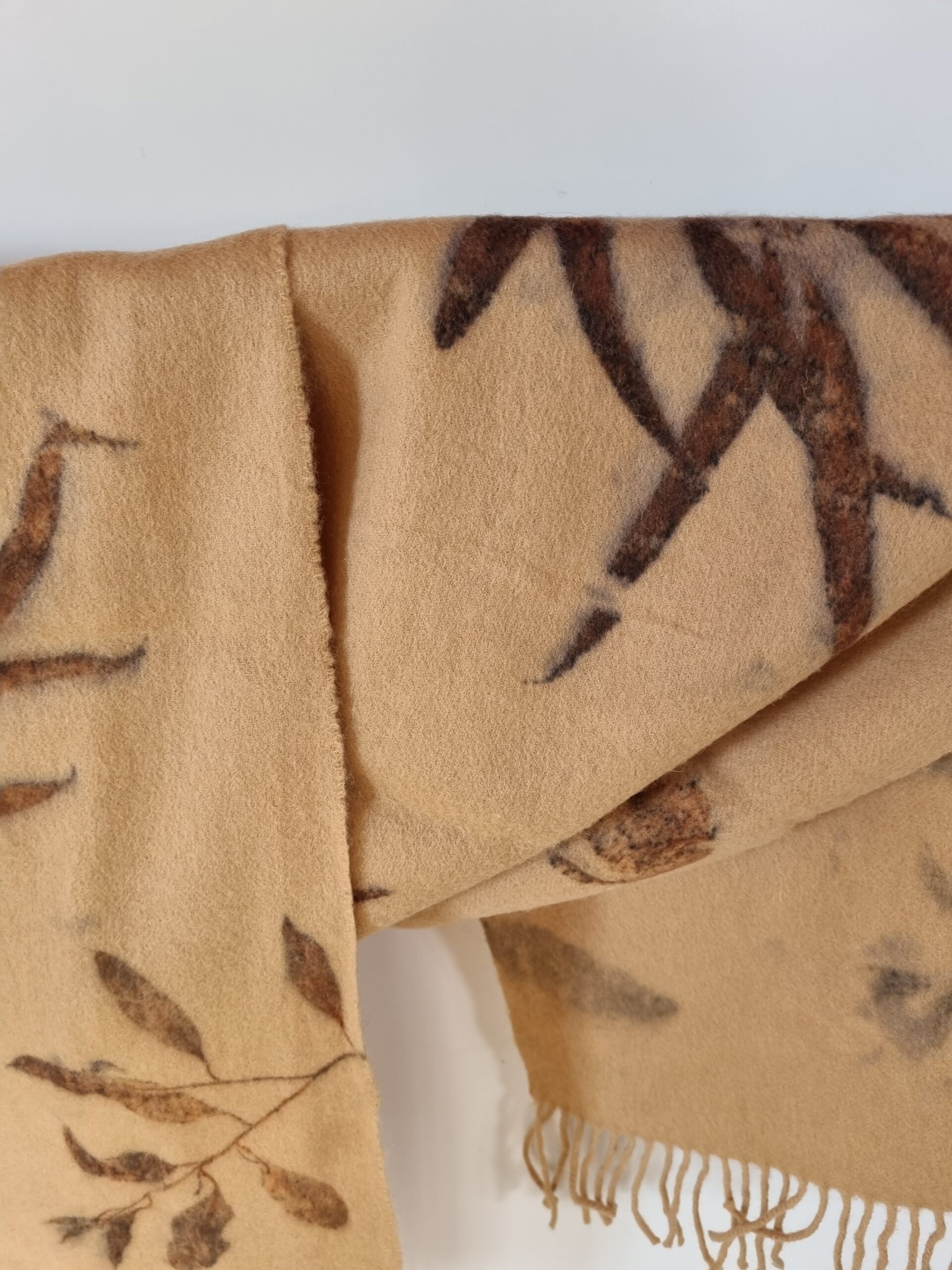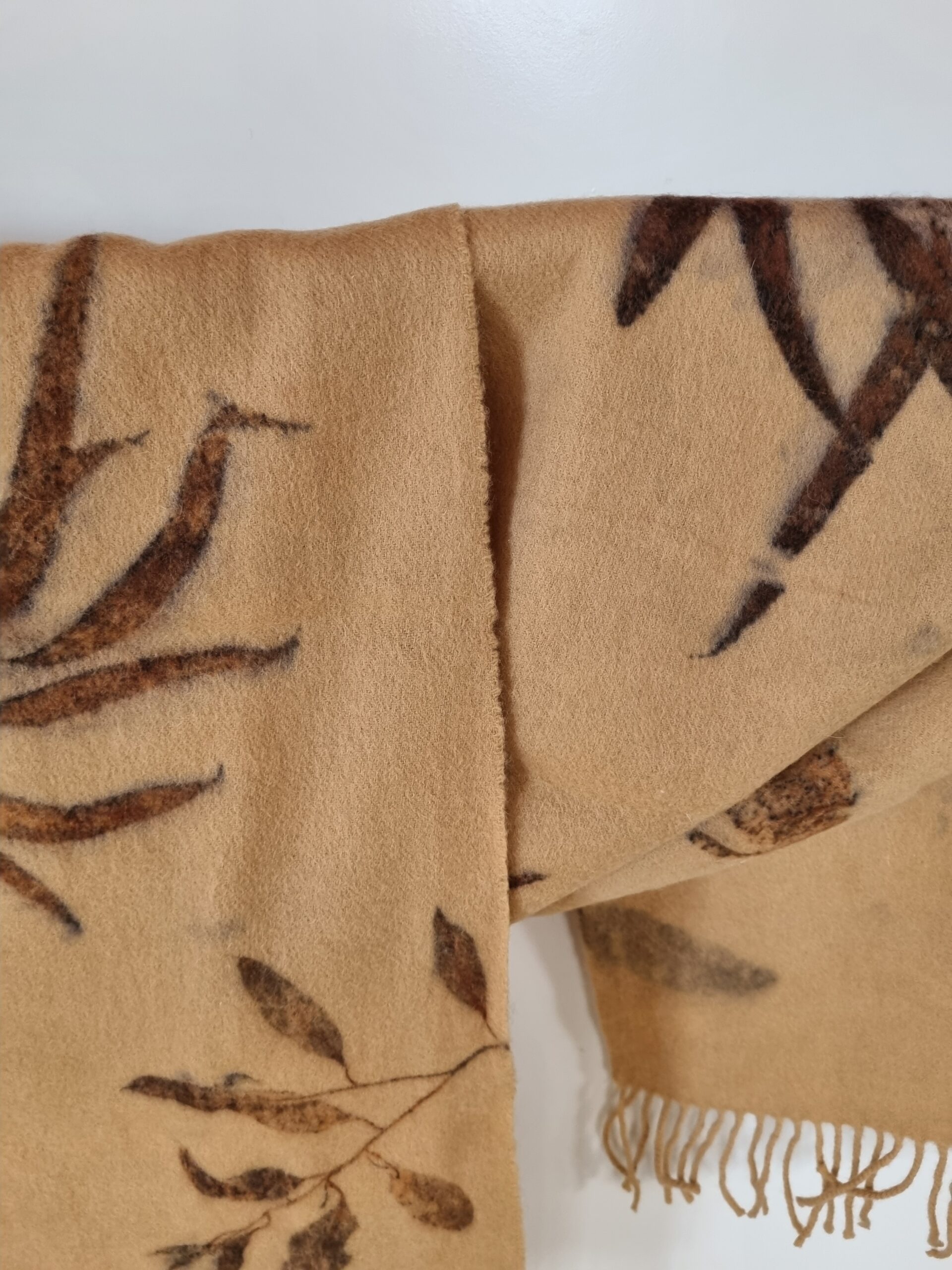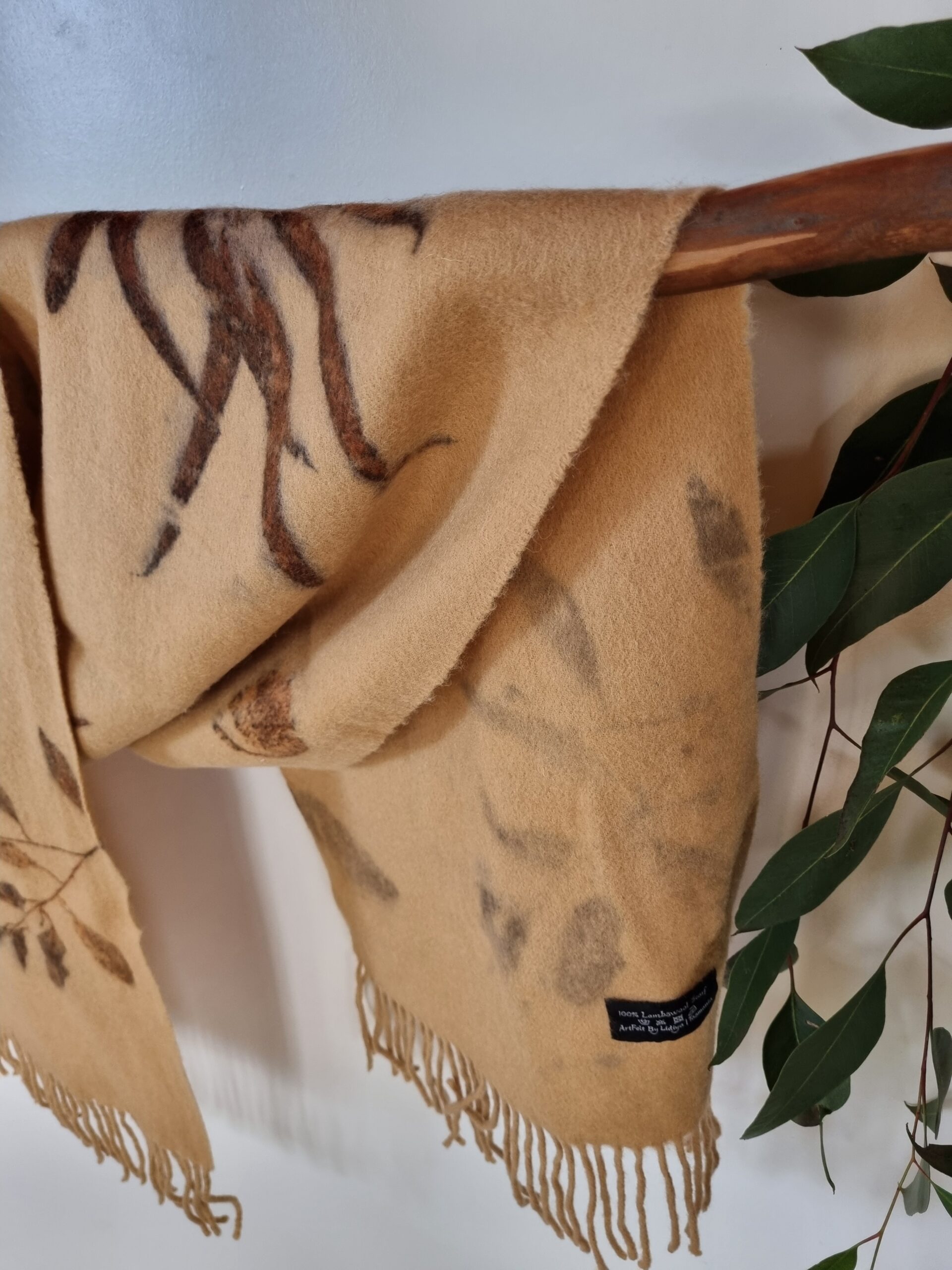 All of my scarfs are naturally dyed in my home studio using various different leaves such as: eucalyptus, fern, maple, birch,  oak, seaweeds and many others, foraged locally from the Tasmanian bush and my garden.  The fresh leaves are contact printed onto the scarf with a gentle steaming process. Once the leaves are used I can’t use them again, and the leaves go back to earth in my compost. That’s why all of the scarves are one of a kind. No nasty chemicals, just the power and hidden beauty of the leaves.