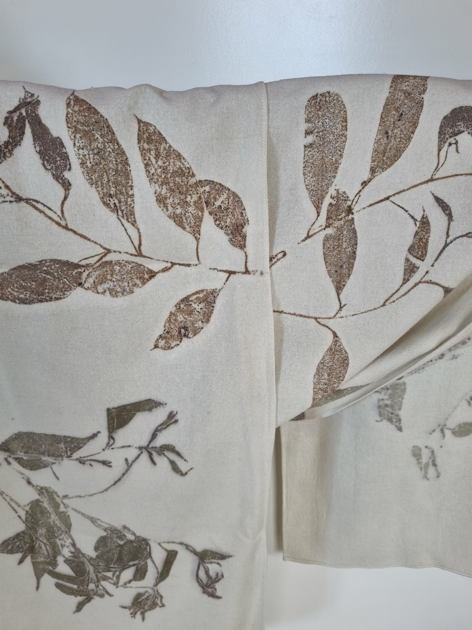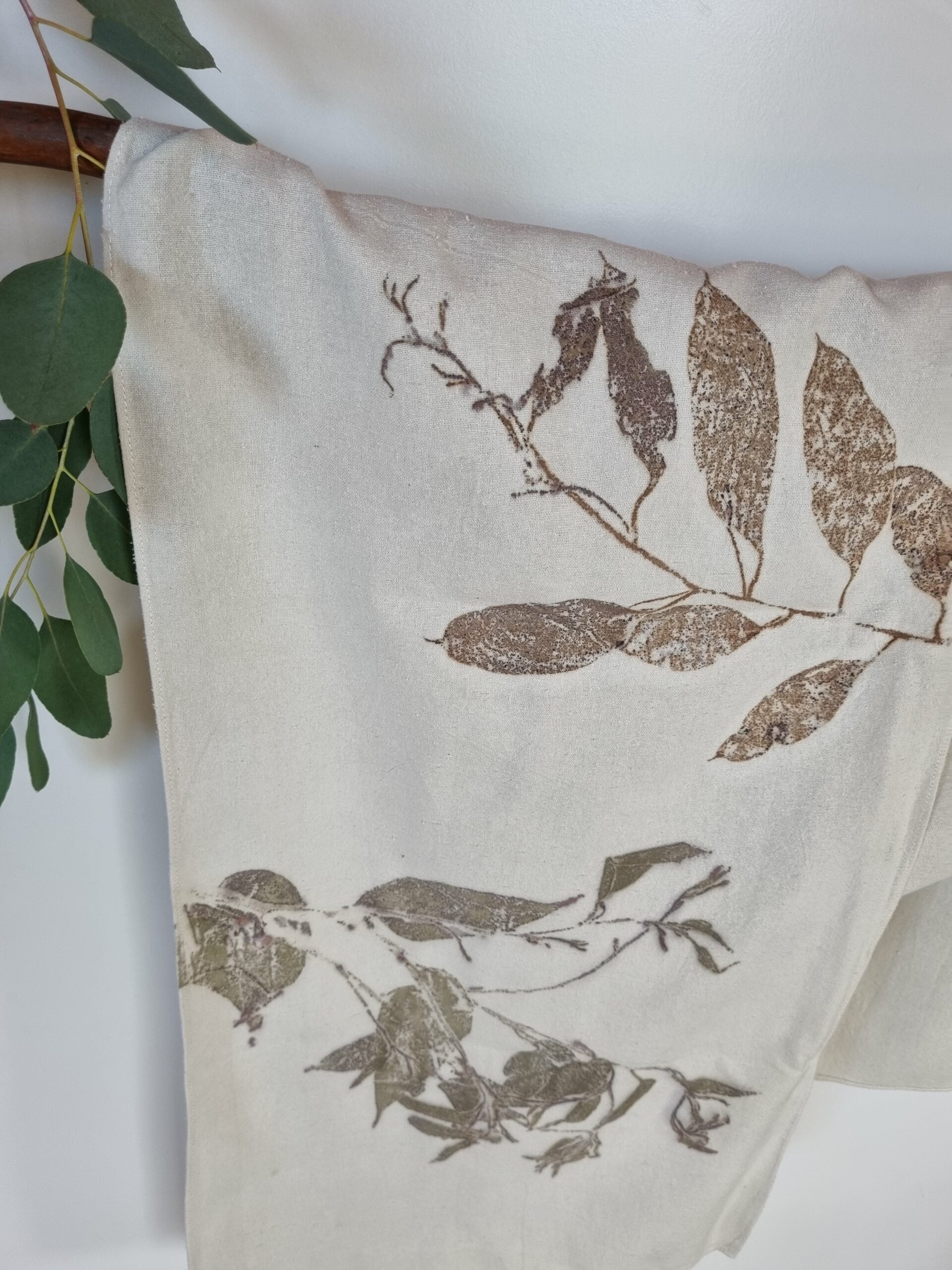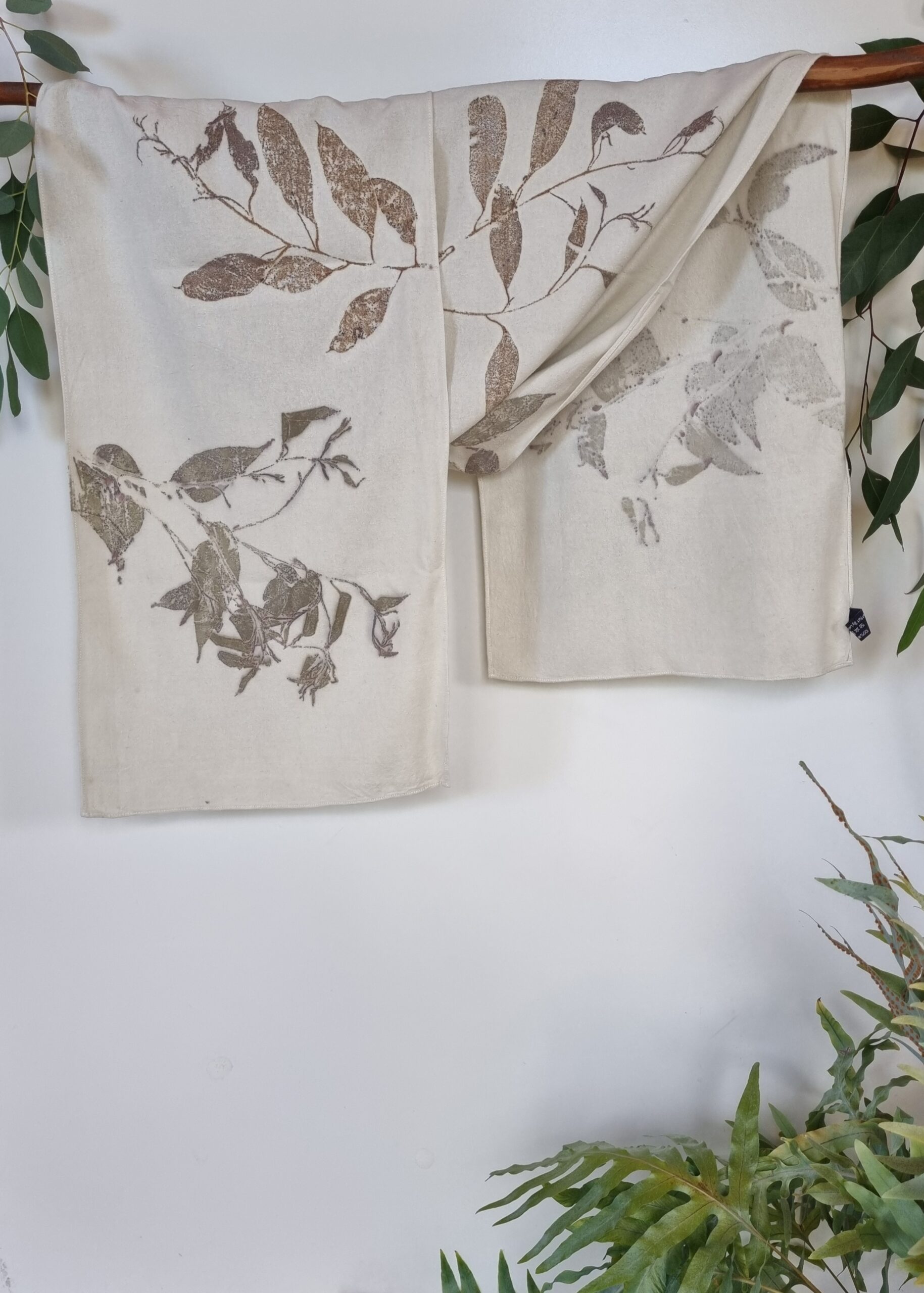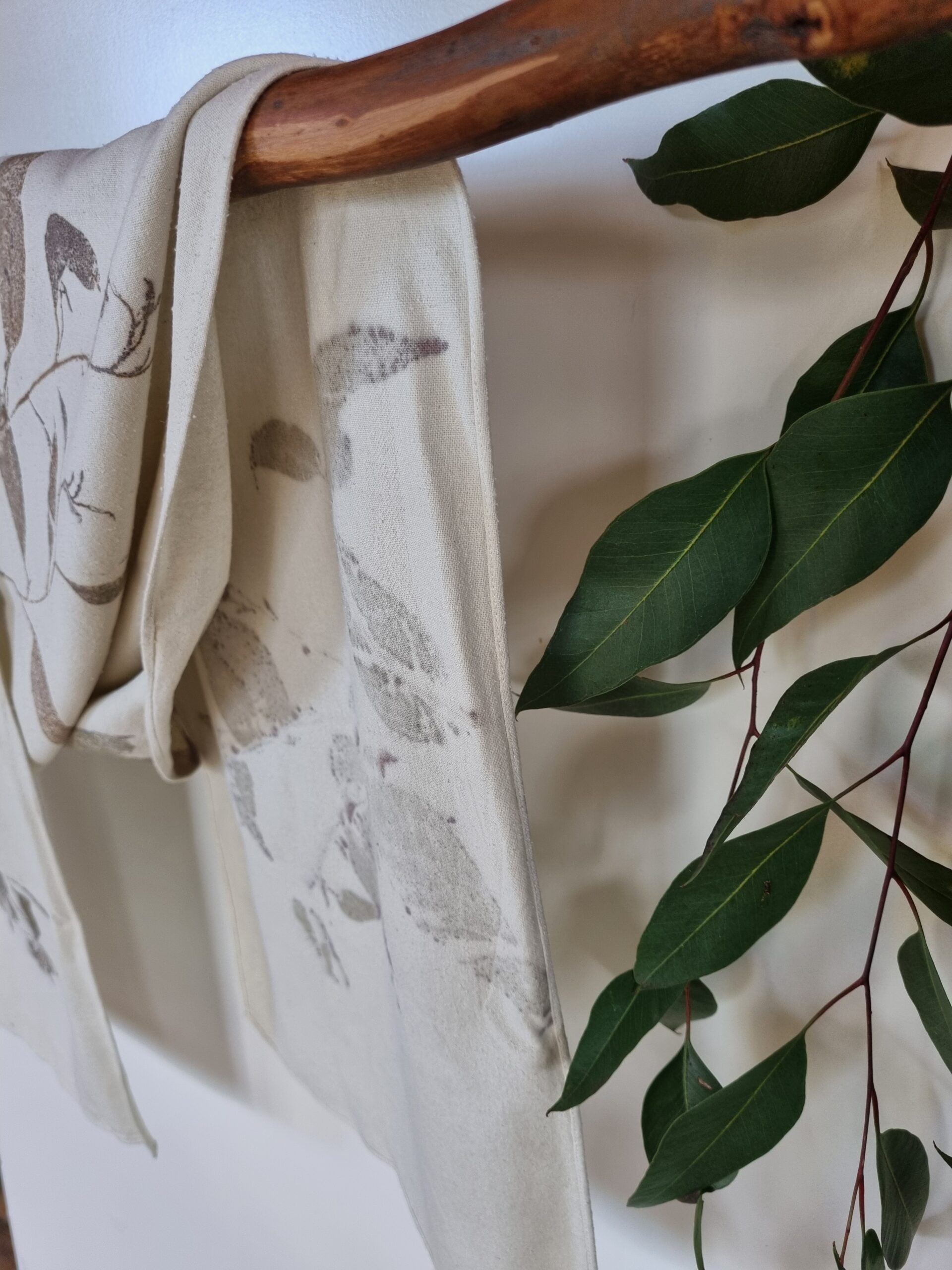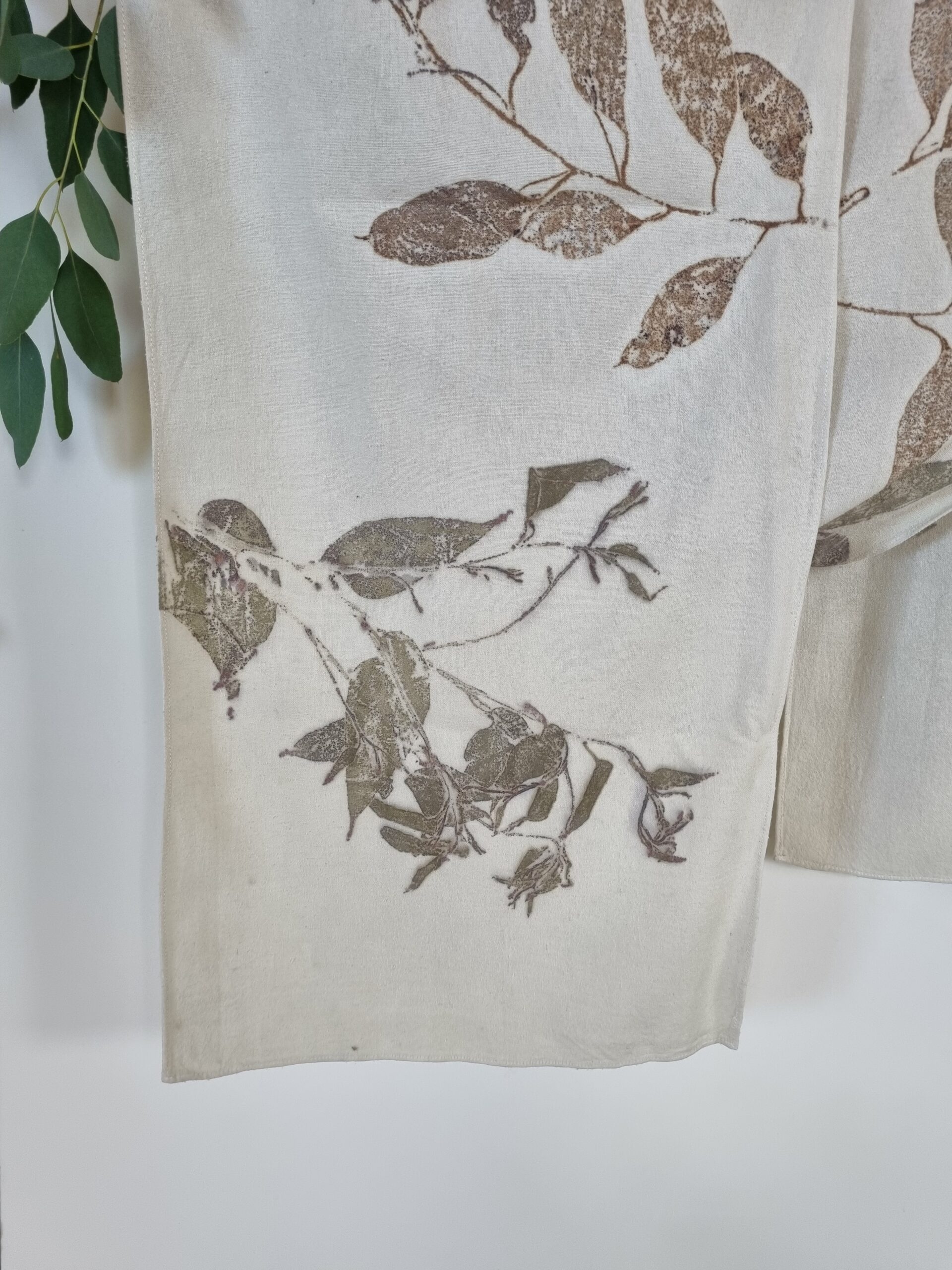 All of my scarfs are naturally dyed in my home studio using various different leaves such as: eucalyptus, fern, maple, birch,  oak, seaweeds and many others, foraged locally from the Tasmanian bush and my garden.  The fresh leaves are contact printed onto the scarf with a gentle steaming process. Once the leaves are used I can’t use them again, and the leaves go back to earth in my compost. That’s why all of the scarves are one of a kind. No nasty chemicals, just the power and hidden beauty of the leaves.